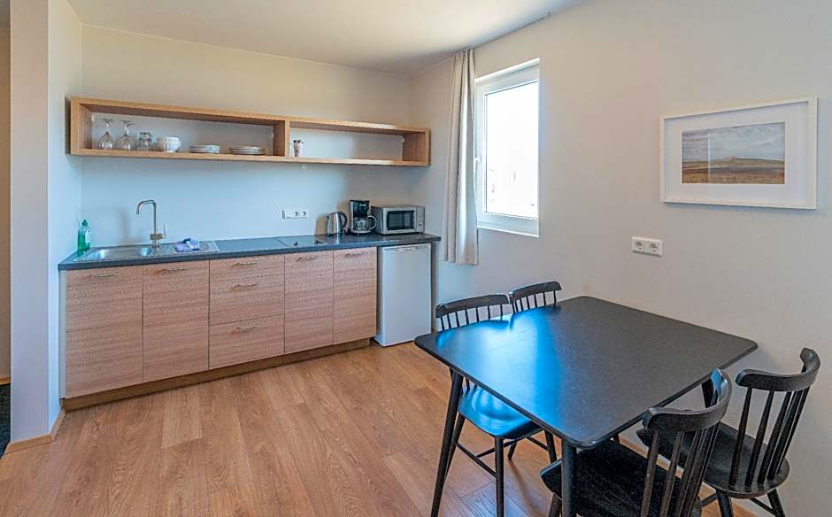 This studio features a kitchenette with a microwave and fridge, a TV and seating area.