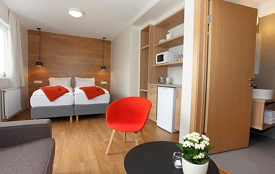 This studio features a kitchenette with a microwave and fridge, a TV and seating area.